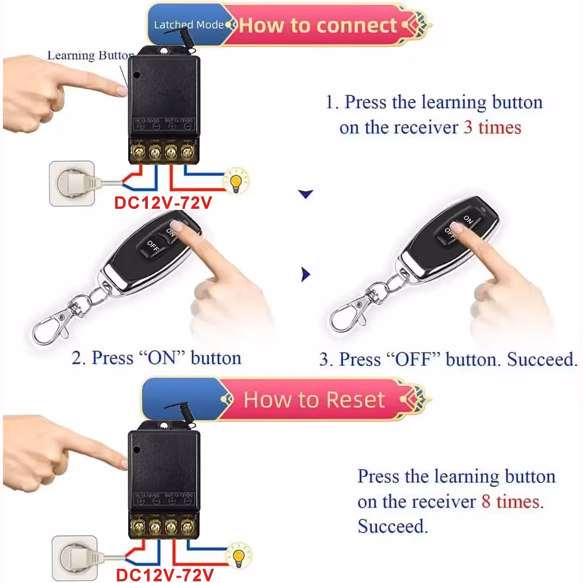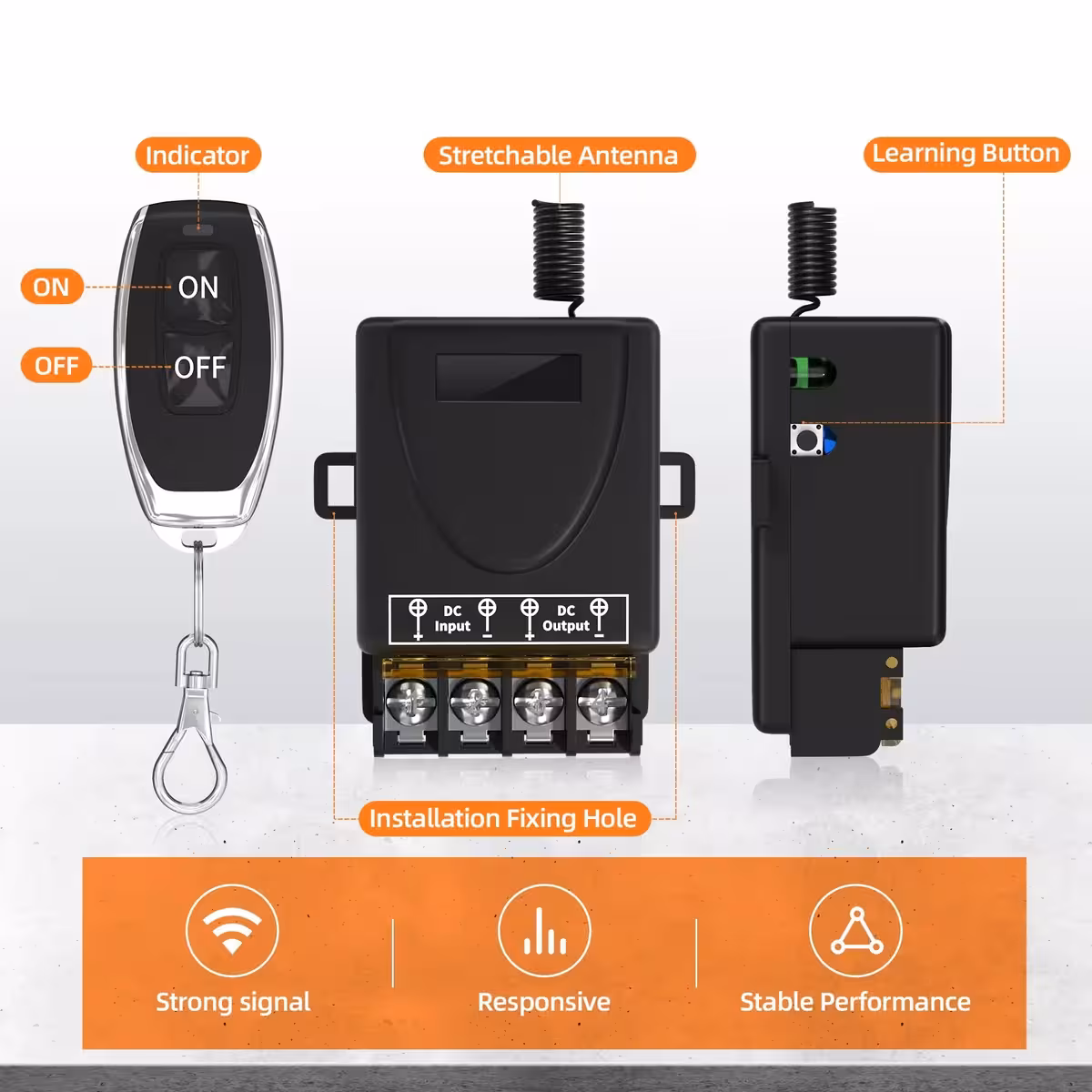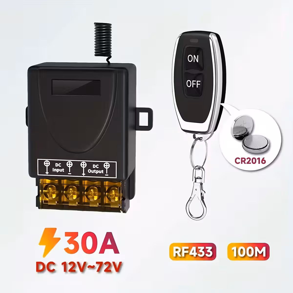 Dit 12V–60V 30A relais met afstandsbediening is een krachtige schakelaar, ideaal voor het op afstand bedienen van pompen, verlichting, machines, stopcontacten, auto- of huishoudsystemen en smart home installaties. Het werkt op RF-frequentie 433,92MHz en wordt geleverd met 2 afstandsbedieningen.