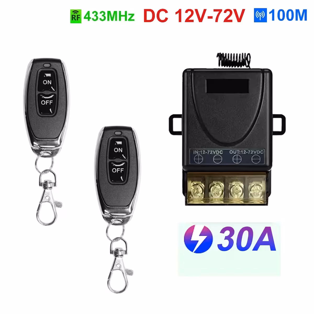 12V–60V 30A Relais met Afstandsbediening – 12V/24V Schakelaar met 2 RF 433MHz Afstandsbedieningen