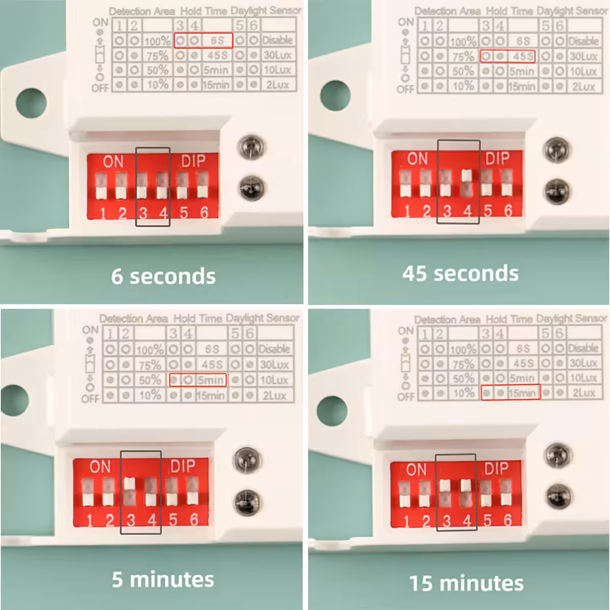 - Aanpasbare tijdsvertraging: 6 seconden, 45 seconden, 5 minuten, 15 minuten.