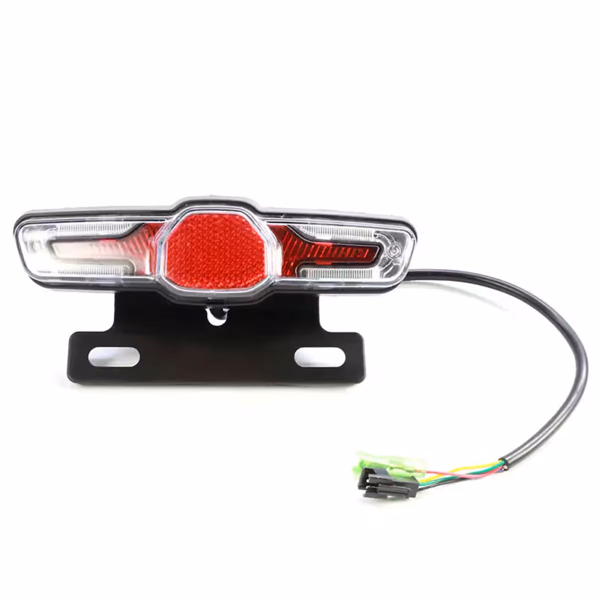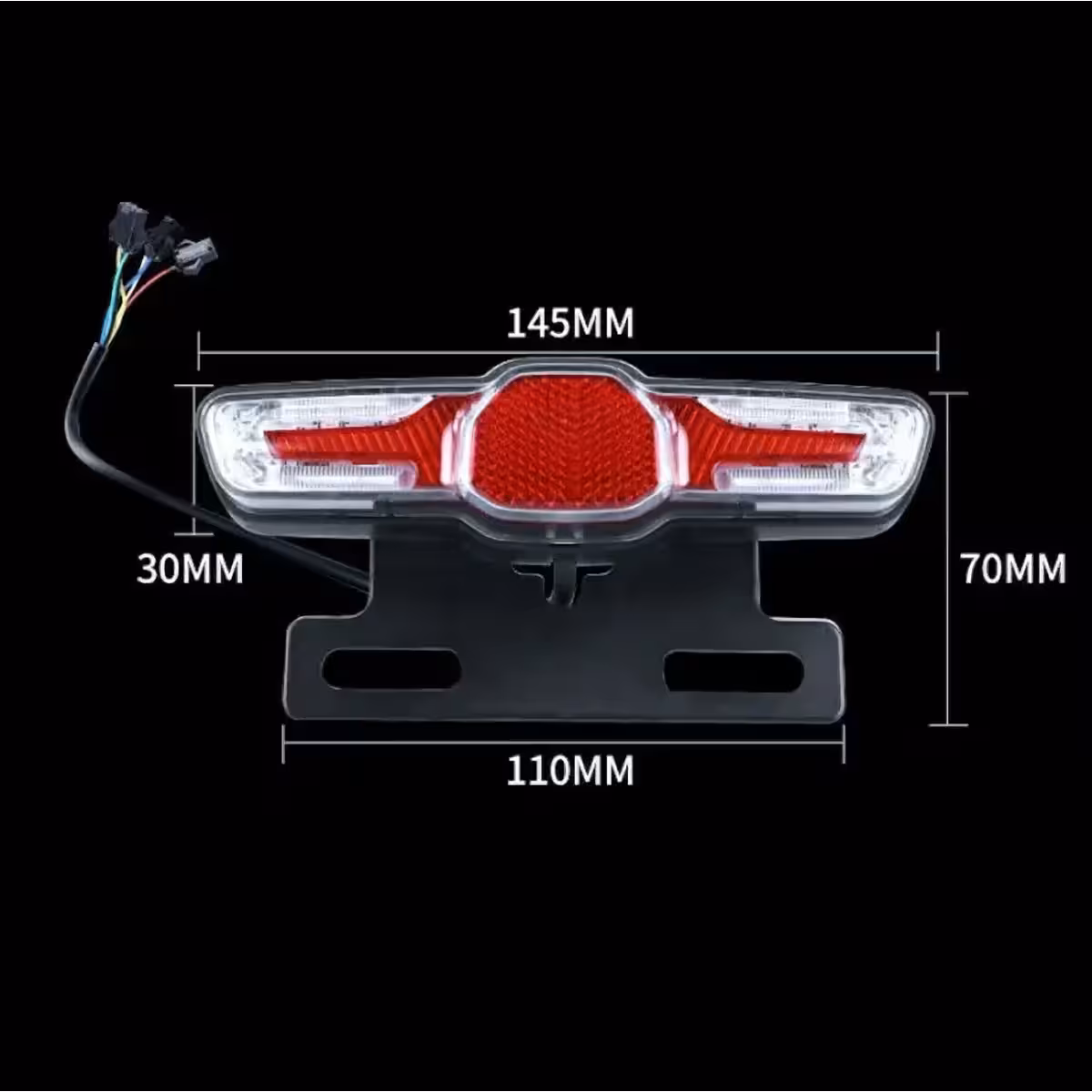 De multifunctionele LED-achterlamp is ideaal voor elektrische steps, elektrische fietsen en elektrische scooters. Biedt functies voor richtingaanwijzers links/rechts, nachtpositie-licht en remlicht.
