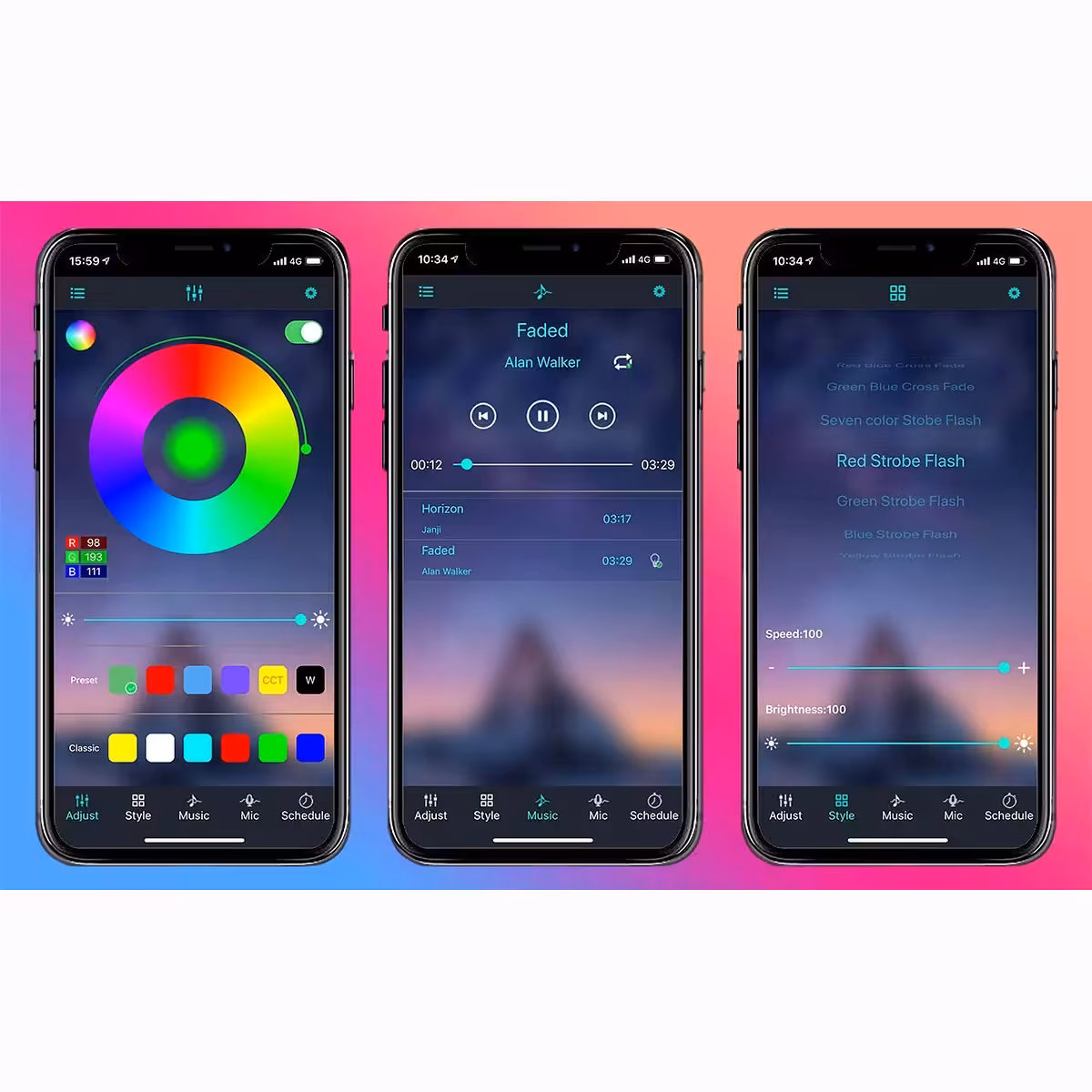 - Geïntegreerde muzieksensor – verlichting reageert op geluid en muziek