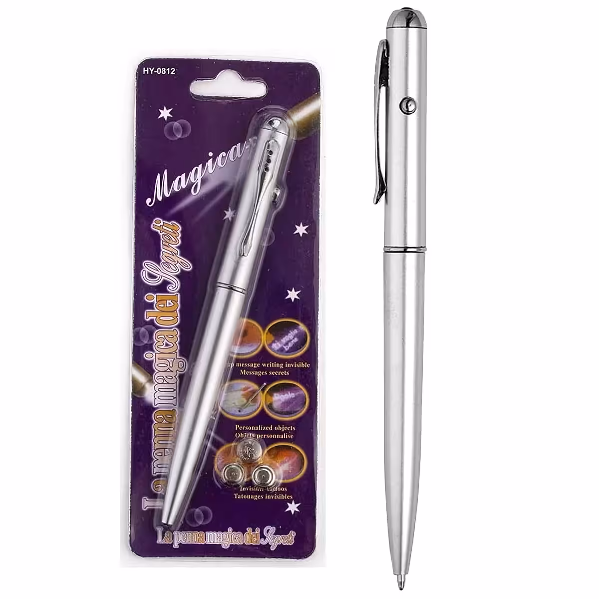 Deze pen met onzichtbare inkt is ideaal voor geheime notities, het markeren van geld, personalisatie van voorwerpen of het detecteren van vervalsingen. De inkt is niet zichtbaar bij normaal licht, maar wordt volledig leesbaar onder ultraviolet licht dat wordt uitgezonden door de geïntegreerde UV-LED lamp aan de penpunt.