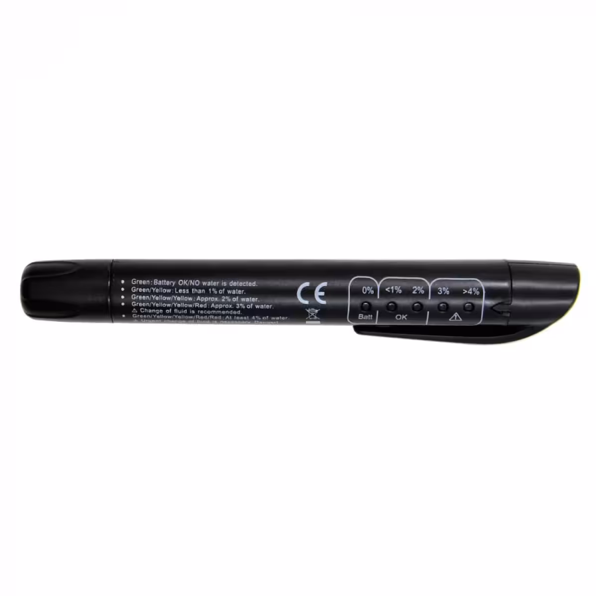 - Groene LED: batterij in orde, watergehalte 0%