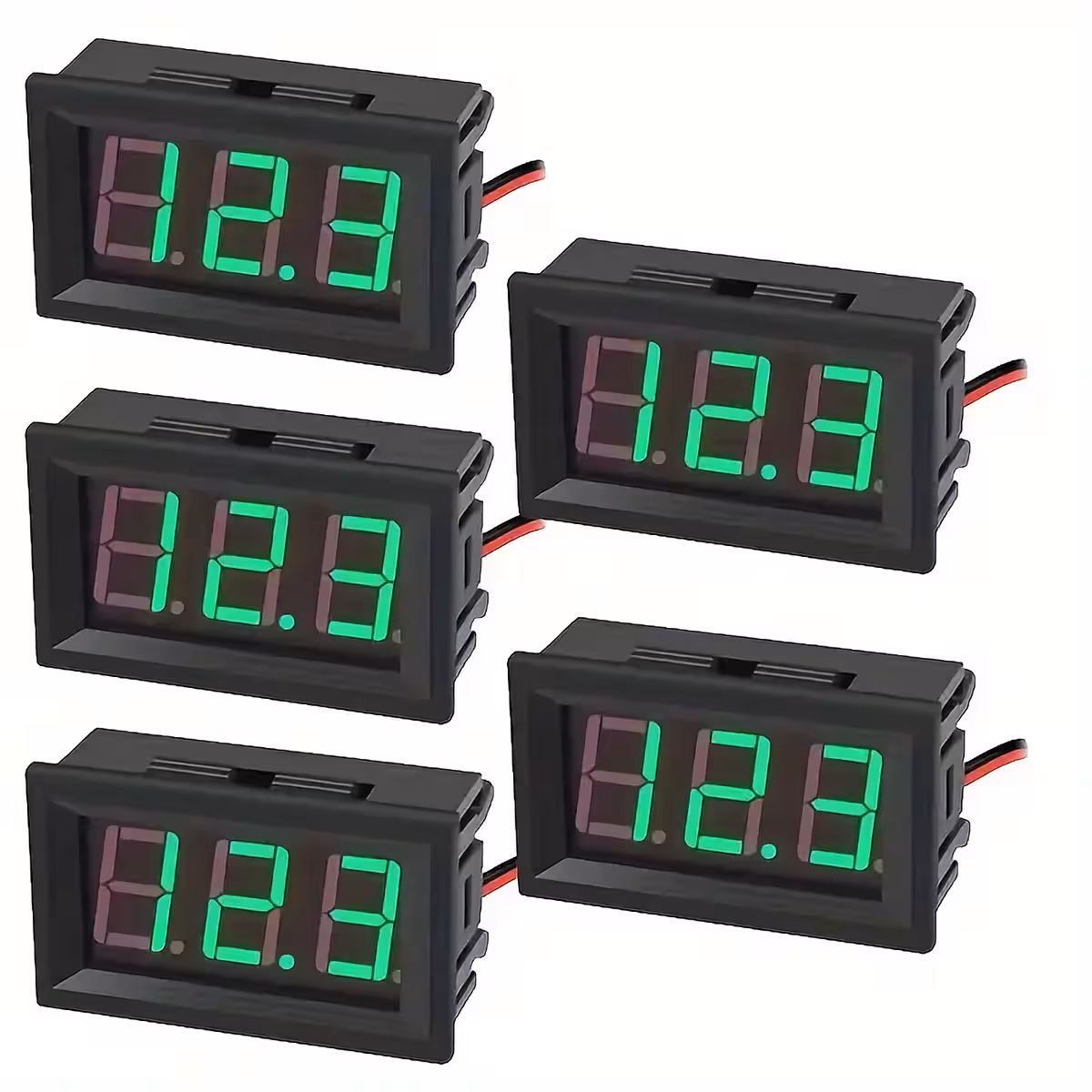 Deze set bevat 5 stuks digitale paneelvoltmeters, perfect voor het meten van gelijkspanning binnen een breed bereik. Met een helder groen LED-display en voeding direct uit de gemeten spanning, zijn deze voltmeters ideaal voor auto-applicaties, zonnestroomsystemen, DIY-projecten en elektronica.