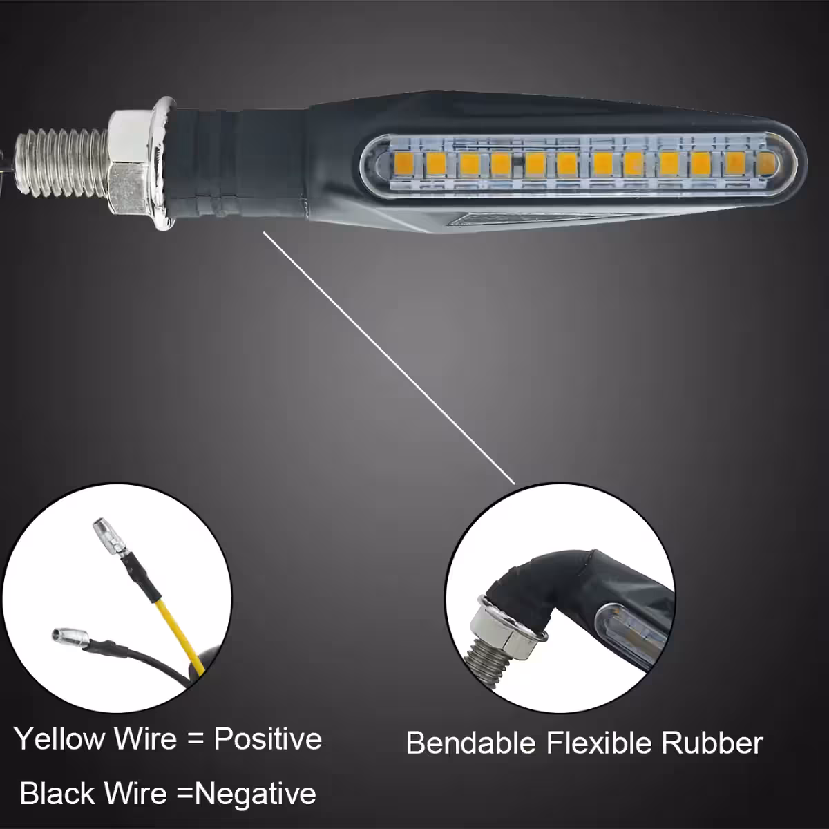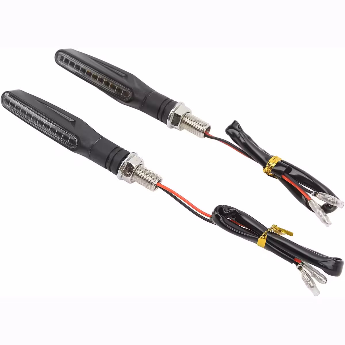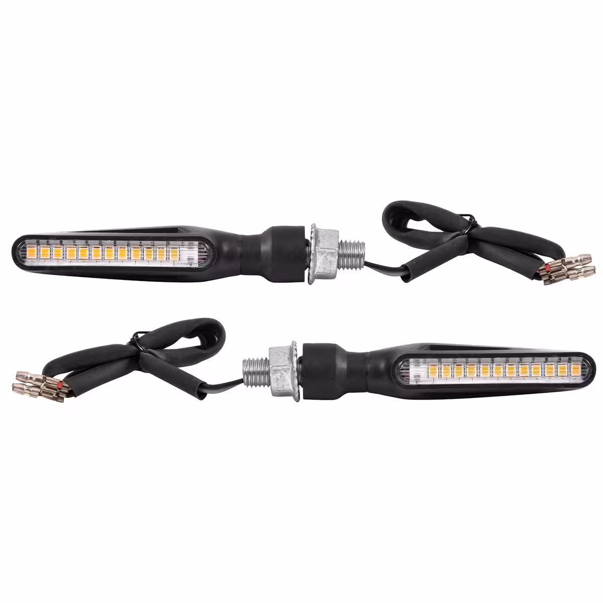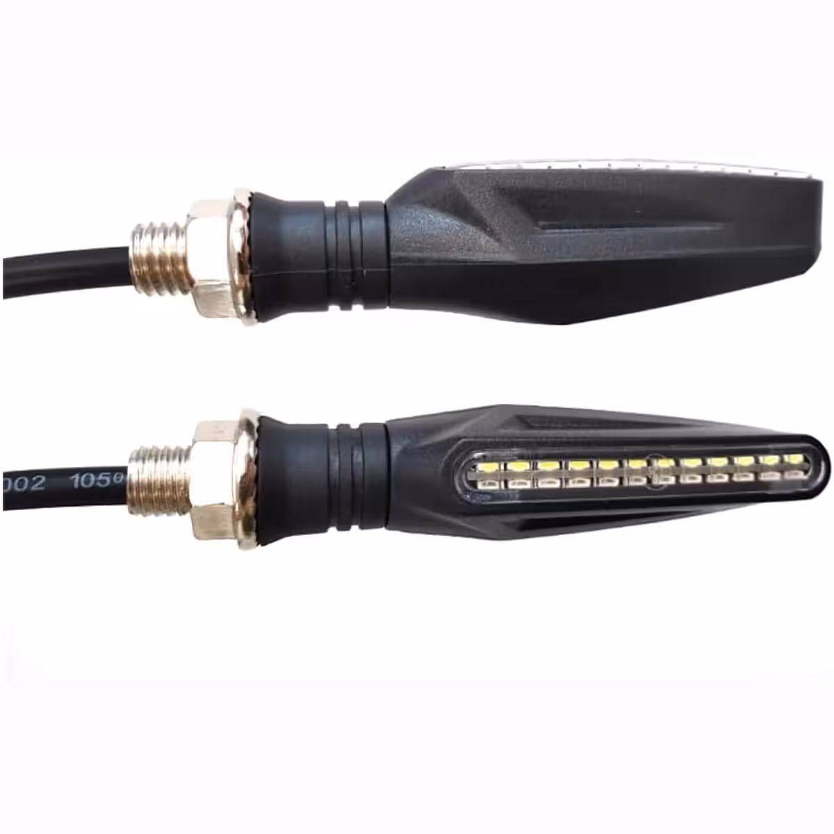 Universele set dynamische LED-motorrichtingaanwijzers met sequentieel effect, compatibel met motoren, scooters en ATV’s. Het moderne ontwerp met strakke randen en vloeiende lijnen biedt een elegante uitstraling, terwijl de LED-technologie zorgt voor laag energieverbruik en krachtige helderheid voor maximale zichtbaarheid.